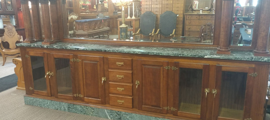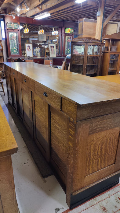 Discover the elegance of our Oak Back & Front Bar, featuring exquisite Carved Lady's and Corinthian Columns. The front bar, a stunning repurposed piece from a Bank Teller Cage, carries a rich history to date back to a 'Fancy Lady's' house in San Francisco from the 1880s. With dimensions of 17ft 8in wide, 42" tall, and 30" deep (40" at the center), this bar is a true statement piece. The back bar complements it beautifully at 16ft wide, ft 11in tall, and 24" deep. $185,000.00 If you need a shipping quote or have any questions feel free to email antiquebroker_1@msn.com or call Ken 303.908.9114